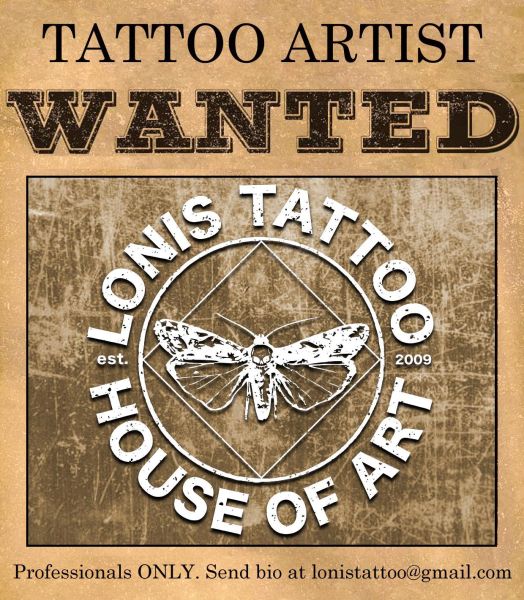 TATTOO ARTIST WANTED AT LONIS TATTOO STUDIO Lonis Tattoo Studio is looking for an experienced tattoo artist. Send us your portfolio at This email address is being protected from spambots. You need JavaScript enabled to view it.. Prev Next